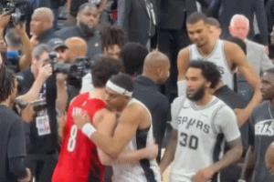 文班与开拓者其他球员、教练组微笑、拥抱、握手致意